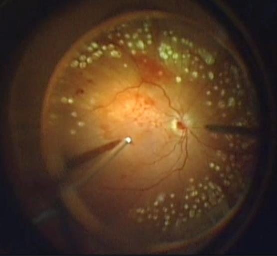 Eine flächige (panretinale) Laserbehandlung der Netzhaut vermindert die Gefahr eines schweren Sehverlusts bei proliferativer diabetischer Retinopathie durch Ausschaltung unterversorgter Netzhaut und Verringern der Konzentration proliferativer Faktoren.