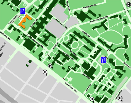 Die Augenklinik ist auf dem Bild in gelb dargestellt. Gebührenpflichtige Kurzzeit-parkmöglichkeiten sind nur in sehr limitierter Anzahl direkt vor der Augenklinik in der Friedrichstraße vorhanden. Für längeres Parken steht das Patientenparkhaus in der Gaffkystraße zur Verfügung, in welchem genügend Parkmöglichkeiten vorhanden sind. Das Parkhaus ist über die Frankfurter Straße, Schubertstraße und Gaffkystraße zu erreichen (siehe Bild).
