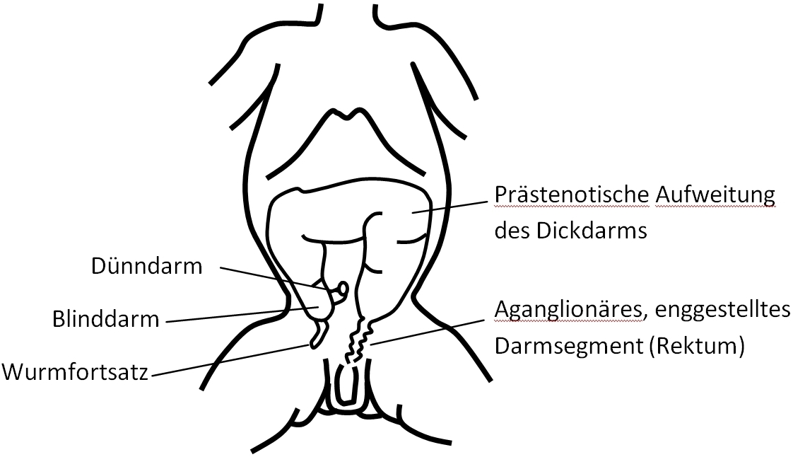 Abbildung 1: Schematische Darstellung eines Säuglings mit Morbus Hirschsprung. Das defekte (aganglionäre) Darmsegment ist eng gestellt. Der Nahrungsbrei/Stuhlgang nicht ausgeschieden werden. Dadurch sammelt sich dieser im gesunden Teil des Dickdarmes, der sich dadurch stark weitet (prästenotische Aufweitung/Dialatation).