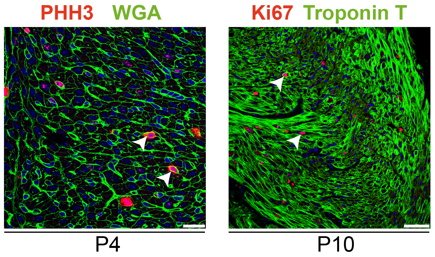 Immunofluorescence staining allows for the detection of proliferating cells in the ventricular myocardium of postnatal day 4 (P4) or 10 (P10) mouse hearts. Mitotic cells can be identified with antibodies against phosphorylated histone H3 (PHH3), whereas Ki67 staining more broadly detects cells in different stages of the cell cycle (both in red, see arrowheads). Cardiomyocytes can either be identified based on size and morphology using WGA (wheat germ agglutinin) membrane staining or by the expression of the sarcomere associated protein troponin T (both in green). (confocal laser scanning microscopy, scale bar = 25 µm in the left and 50 µm in the right panel, nuclei are stained in blue)