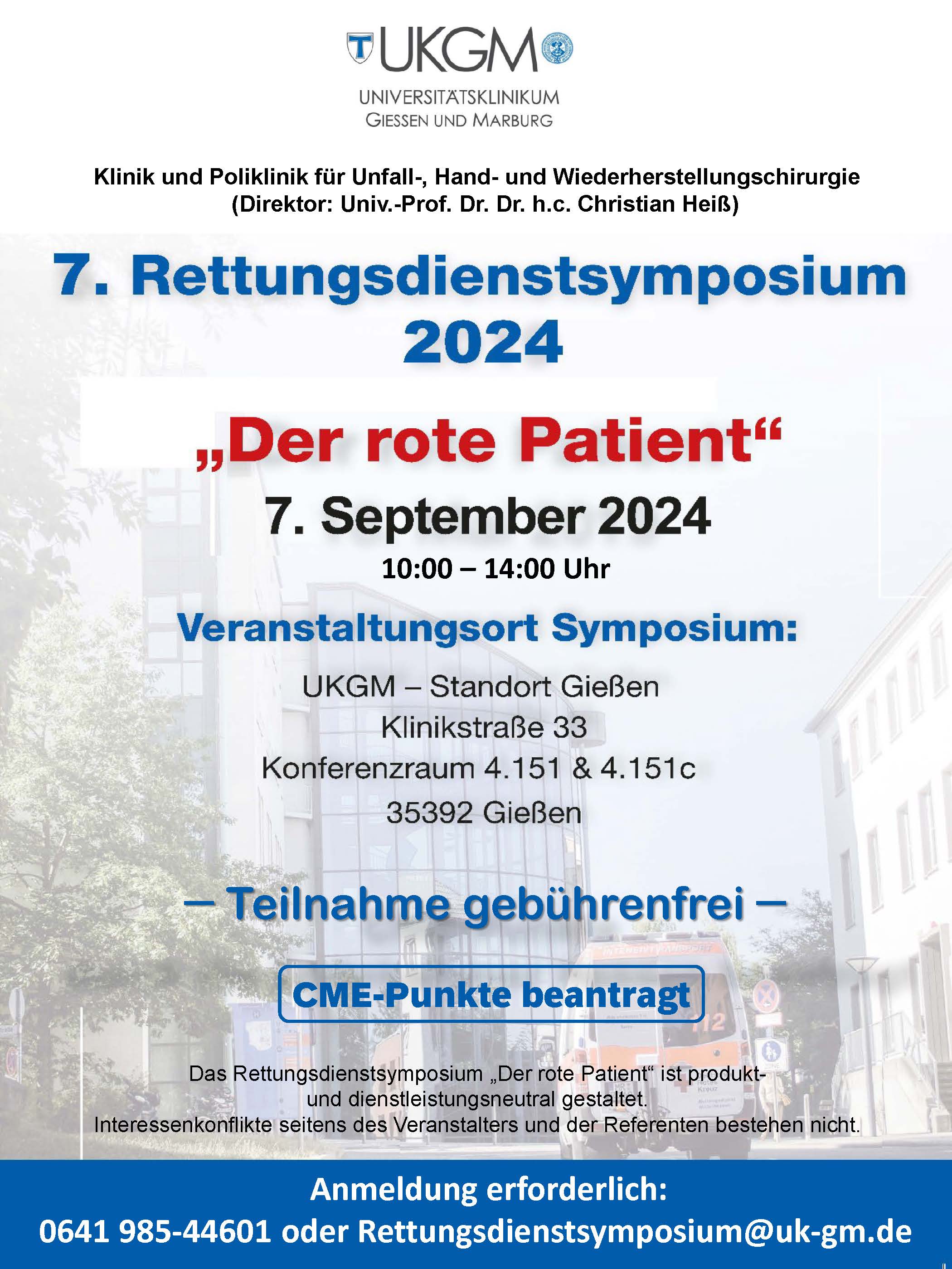 Das Rettungsdienstsymposium "Der rote Patient" ist produkt- und/oder dienstleistungsneutral gestaltet. Interessenkonflikte seitens des Veranstalters und der Referenten bestehen nicht. Ein Sponsoring der Veranstaltung liegt nicht vor.