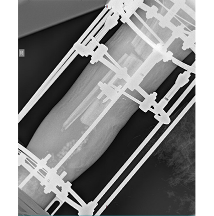 Abb. 1 Knochendefektrekonstruktion mittels Ilizarov-Ringfixateur und Kallusdistraktion bei einem unkrainischen kriegsverletzten Soldaten