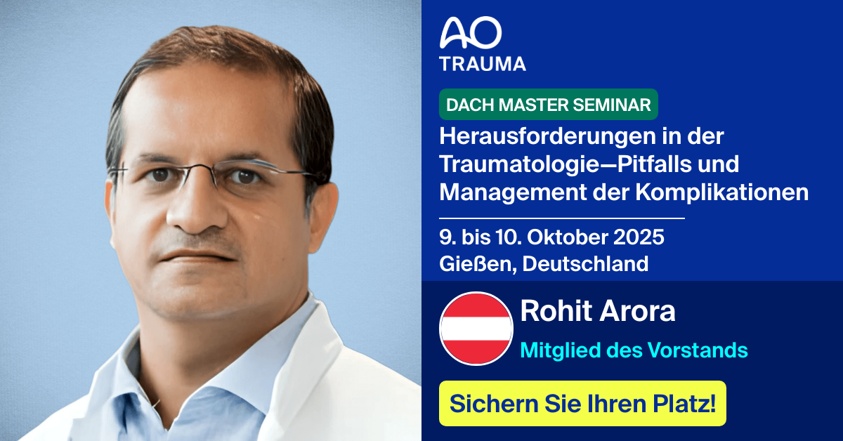 Anhand einer Kombination aus fall- und evidenzbasierten Vorträgen, Fallpräsentationen und Diskussionen in Kleingruppen werden die wichtigsten praxisrelevanten chirurgischen und medizinischen Herausforderungen in der Traumatologie - Pitfalls und Management der Komplikationen u.a. von komplexen, kindlichen und periprothetischen Frakturen erlernt.