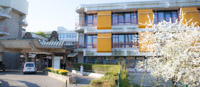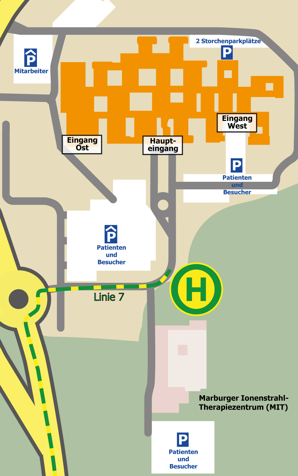 Die Eingänge befinden sich auf Ebene 0 und werden in Eingang Ost (Kopfklinik: Dermatologie & Allergologie, HNO), Haupteingang (Pneumologie) und Eingang West (Mutter-Kind-Zentrum: Kinder & Jugendmedizin) unterschieden.
