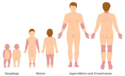 Die Ekzeme können über den ganzen Körper verteilt sein, finden sich jedoch altersabhängig bevorzugt an bestimmten Körperarealen.