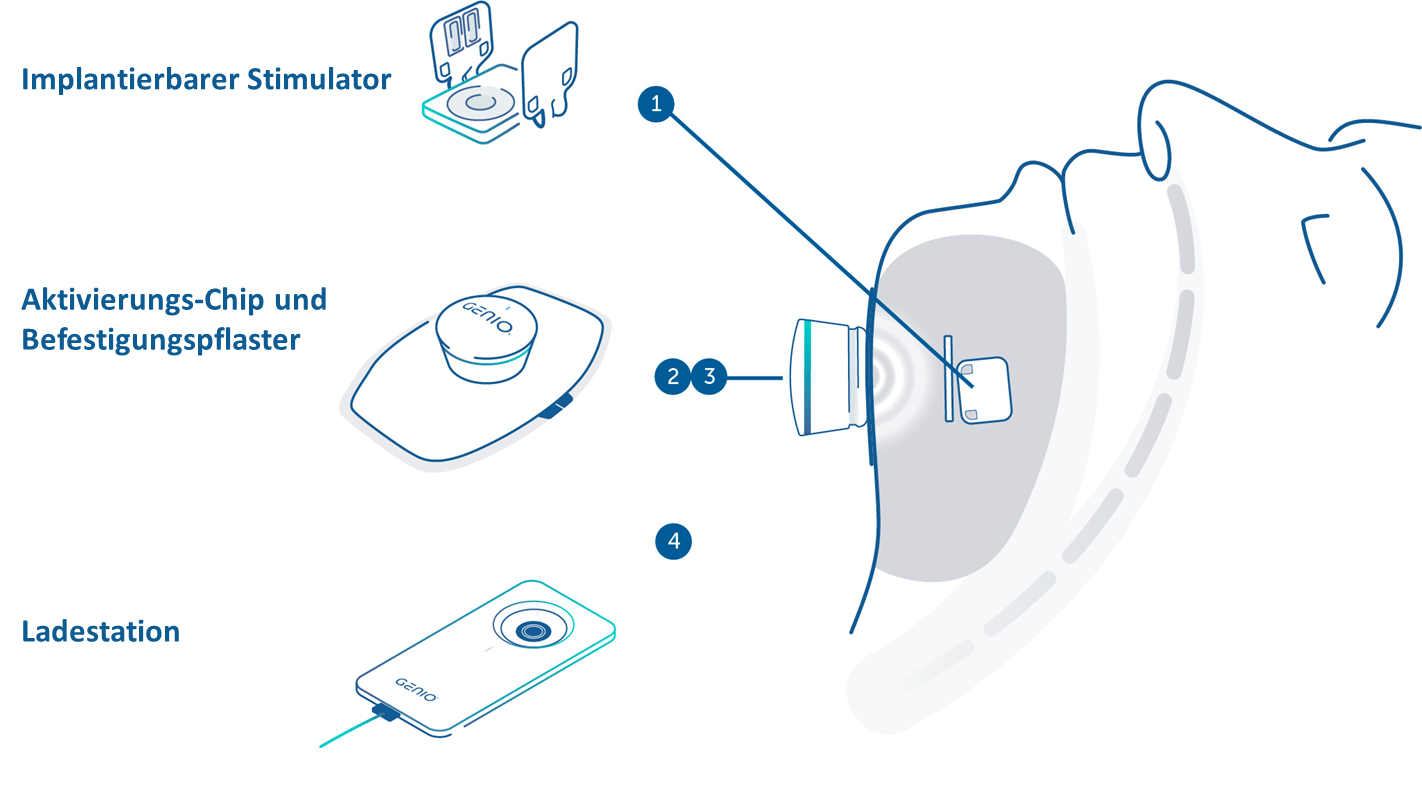 Das Genio®-System arbeitet ohne implantierten Impulsgeber im Brustbereich – also ohne Batterie und Verbindungskabel. Das Implantat unter dem Kinn wird über ein kleines externes Gerät aktiviert, das aufgeklebt wird. So werden ebenfalls Impulse an den Zungennerven gesendet, die die Atemwege offenhalten und Atempausen sowie Schnarchen deutlich reduzieren.