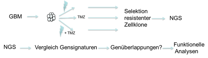 Dazu isolieren wir GBM SZ aus reseziertem Patientenmaterial mittels eines Neurosphären-Formations-Assays. Danach ist der erste Schritt unseres Arbeitsablaufs die Charakterisierung der generierten Zellen. Dazu gehören unter anderem Differenzierungsassays, FACS Analysen, Untersuchungen der Invasionsfähigkeit und in vivo Experimente in Naktmäusen. Nach der Charakterisierung und Validierung des Stammzell-Phänotyps werden die Zellen in vitro der gleichen Therapie aus Bestrahlung und TMZ unterzogen, mit welcher die Patienten in der Klinik behandelt werden. Anschließend werden mittels RNAseq die behandelten und unbehandelten Zellen auf genomischer Ebene verglichen. Für die Resistenz verantwortliche Gene zeigen sich hierbei selektiv hoch bzw. runter reguliert. Im Anschluss werden diese Gene mittels qPCR, Knockdowns und in vivo Experimenten genauer analysiert. Es ist unser Ziel auf diese Weise genomische Parameter zu identifizieren, welche eine effektivere adjuvante Therapie für GBM Patienten ermöglichen.