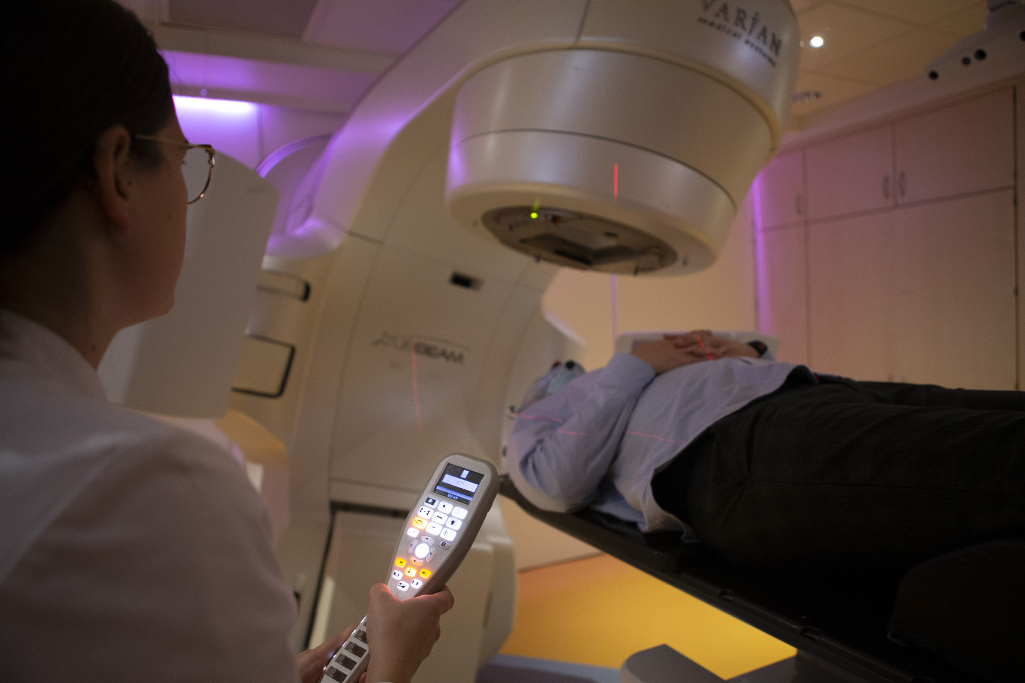 Die Bestrahlung selbst findet normalerweise 5mal pro Woche statt (Montag bis Freitag). Die erste Bestrahlung, die sogenannte Ersteinstellung, dauert etwas länger. Hierbei werden die Einzelheiten der Bestrahlung nochmals genau überprüft, bevor die Behandlung dann endgültig durch einen Strahlentherapeuten freigegeben wird. Alle nachfolgenden Behandlungen dauern nur wenige Minuten. Während dieser Zeit stehen Sie über eine Kamera und eine Gegensprechanlage in ständigem Kontakt mit einem Mitarbeiter.