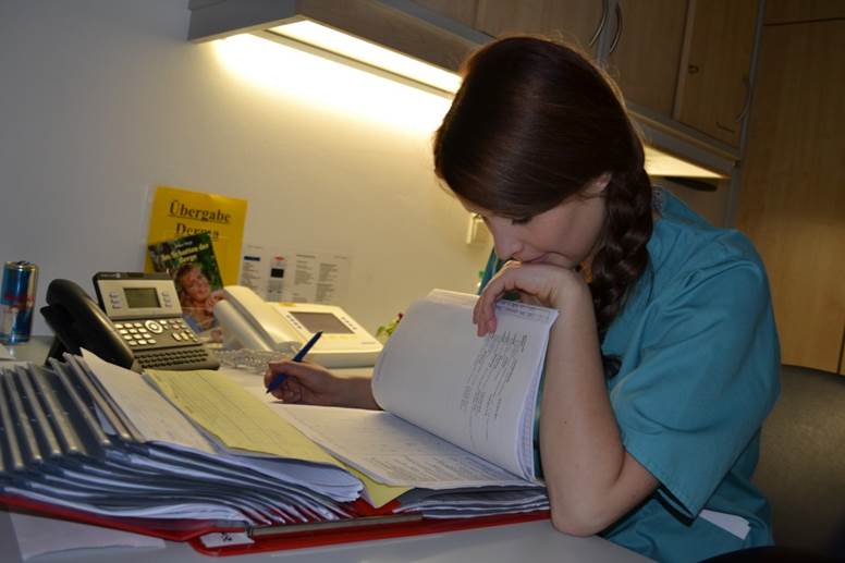Verständlicherweise brauchen wir den ersten Dienst erst einmal, um uns zu positionieren, einzuarbeiten und unseren Platz auf der Station zu finden. So wird es auch in den kommenden Tagen mit Sicherheit immer wieder sein, wenn wir die Schichtart wechseln oder uns einem anderen Bereich zuordnen – aber schon im ersten Spätdienst am Samstag zeichnet sich deutliche Entspannung ab und wir sind dem examinierten Stationsteam unendlich dankbar, dass es uns mit Rat und Tat in allen Situationen zur Seite steht und mit der notwendigen Fachkompetenz begleitet und in die praktischen Arbeitsabläufe einführt. Nicht zuletzt ist auch die Tatsache, dass der gesamte Kurs mal auf einer Station zusammenarbeitet, etwas, das uns positiv in die nächste Woche schauen lässt – wie man sieht.